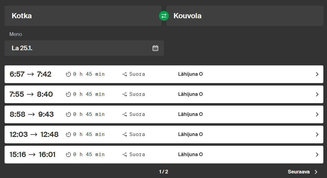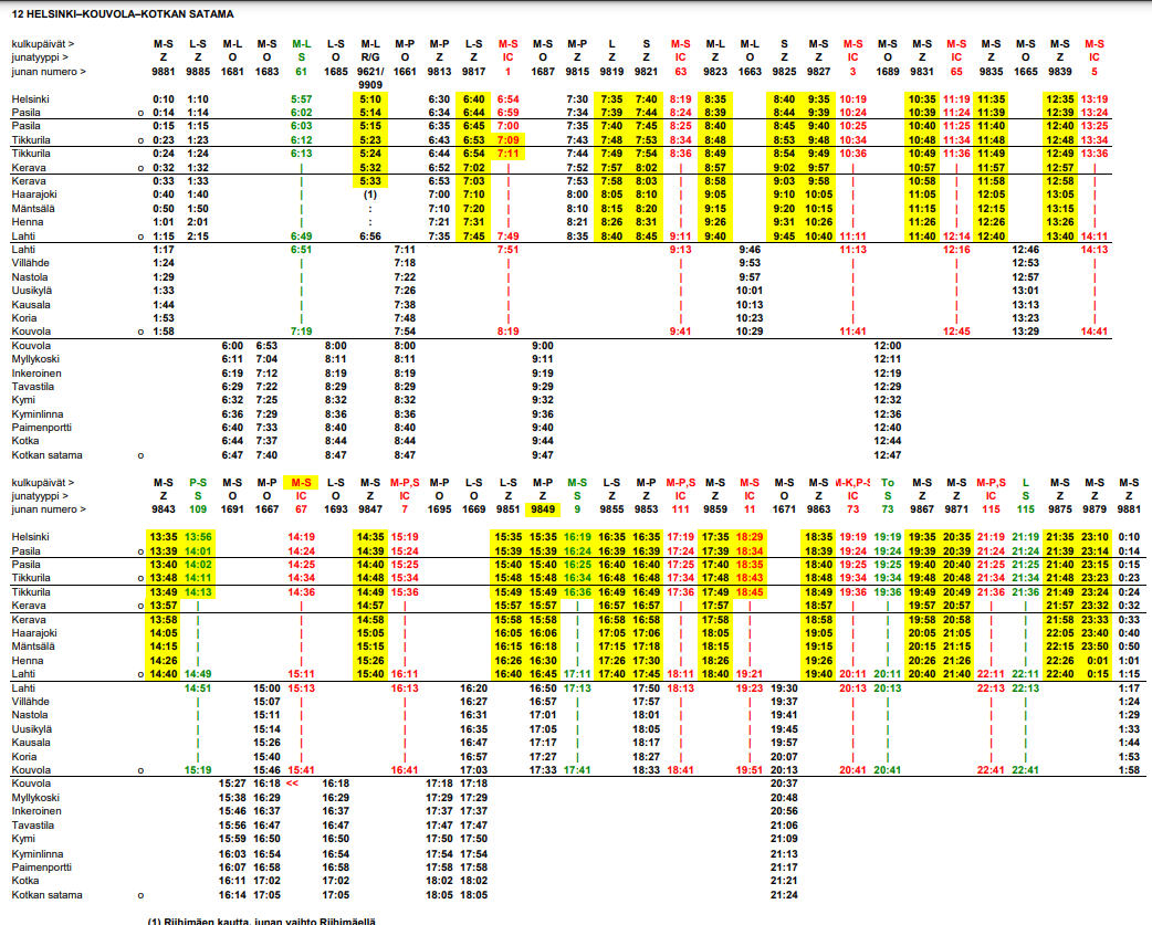 - Kotkasta Kouvolaan: 06:00, 07:00, 08:00, 09:00, 10:00, 11:00…