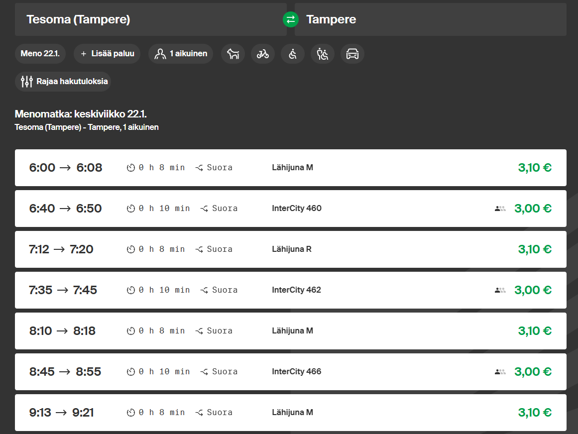 Keskimääräinen matka-aika Tesomalta Tampereen päärautatieasemalle on noin yhdeksän minuuttia, joten tämä asema on ihanteellinen valinta päivittäisille työmatkalaisille.
