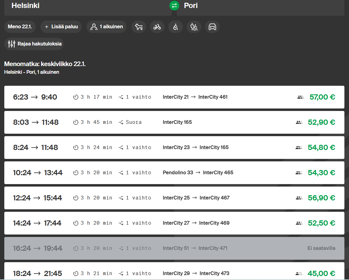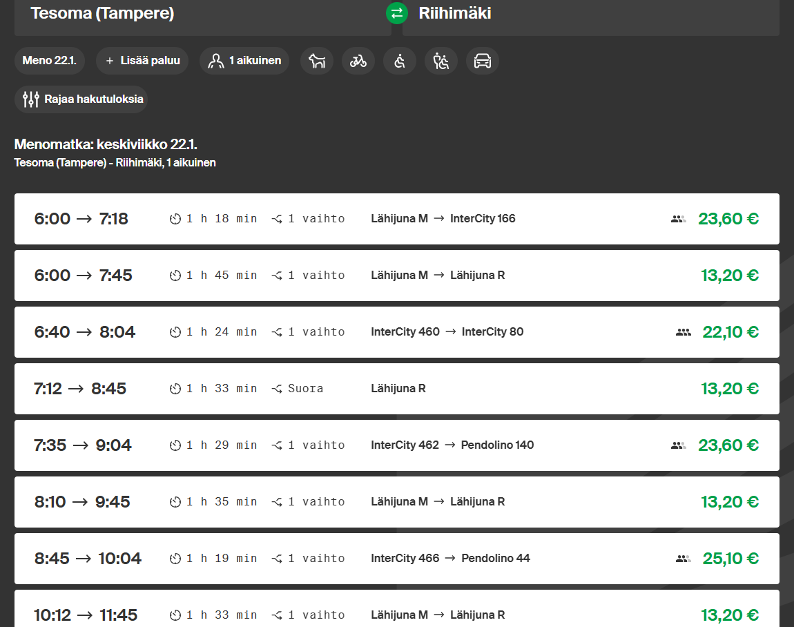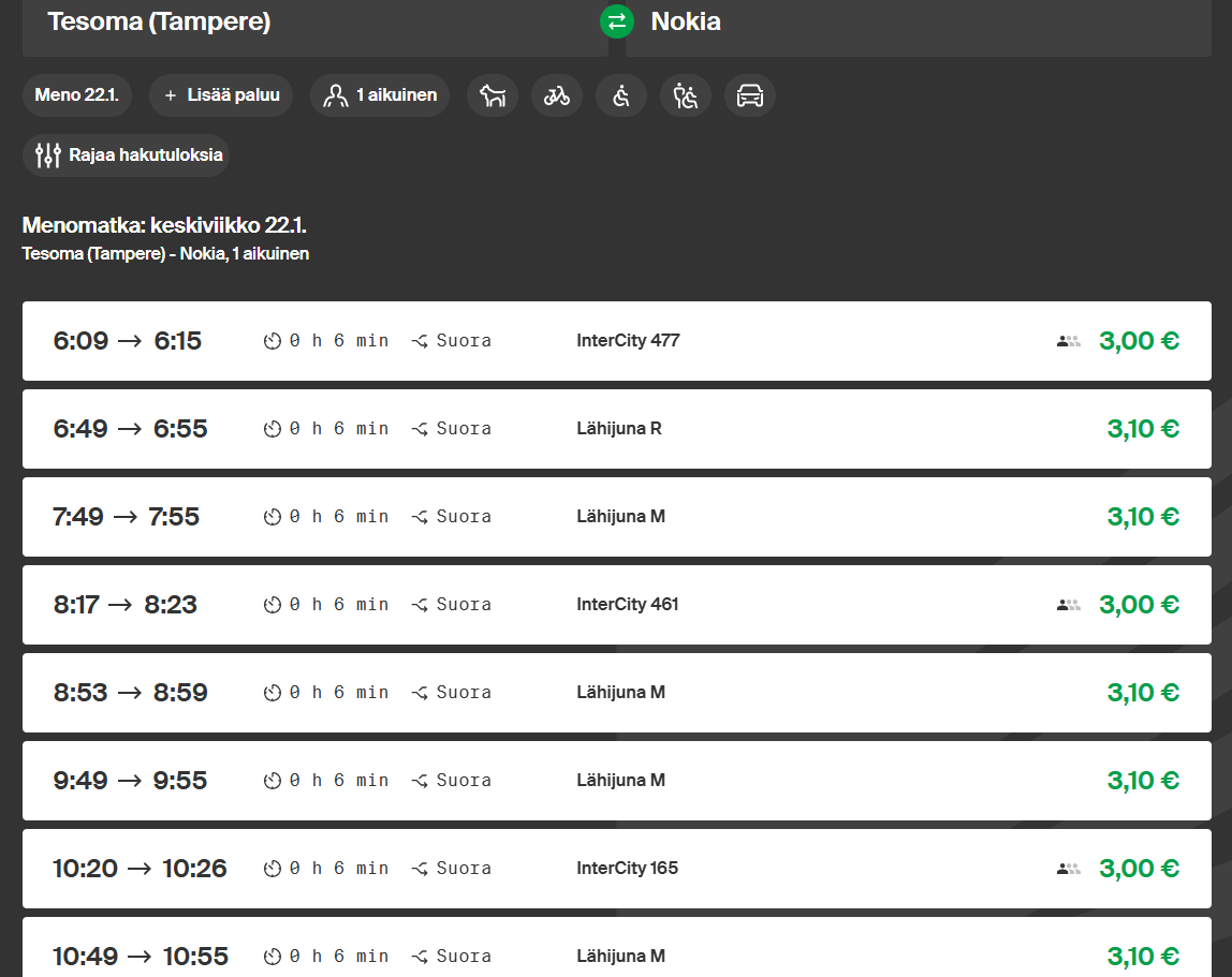 Hinnat vaihtelevat matkan pituuden ja valitun lipputyypin mukaan, mukaan lukien yksittäiset liput, päivä- ja kuukausiliput. Lippuja voi ostaa helposti VR:n sovelluksen kautta, viralliselta verkkosivustolta tai integroitujen liikennejärjestelmien, kuten Nyssen, kautta. Nämä vaihtoehdot tarjoavat joustavuutta ja mukavuutta, ja käyttäjät voivat valita liikkumistarpeisiinsa parhaiten sopivan vaihtoehdon.