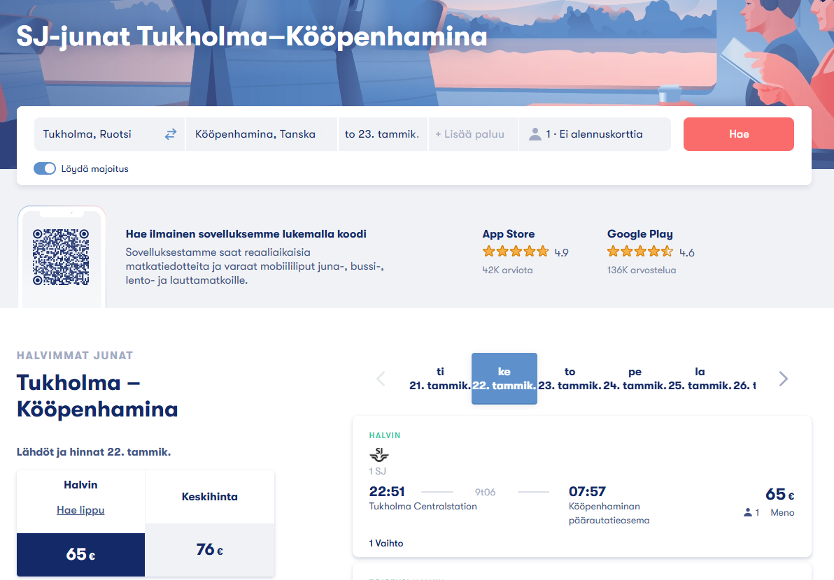 Junalippujen hinnat Tukholmasta Kööpenhaminaan vaihtelevat palveluluokan ja ostohetken mukaan. Omiossa voit saada jopa 32 euroa yhdensuuntaisesta lipusta. Mutta Interrail Euraililla toisen luokan paikkojen hinnat ovat: 3 päiväksi 119 euroa ja 4 päiväksi 142 euroa ja niin edelleen päivistä riippuen, kun taas ensimmäisessä luokassa 3 päiväksi 139 ja 4 päiväksi 167 euroa. Jos haluat enemmän joustavuutta, Interrail One Country Pass on erinomainen vaihtoehto, sillä sen avulla voit matkustaa edullisesti ja joustavasti yhden maan sisällä.